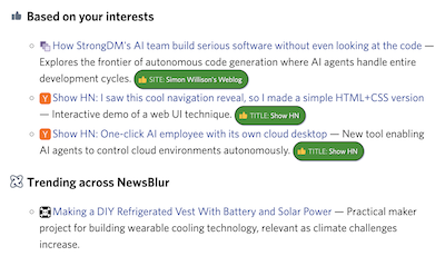 See the full comparison| Apr 05, 2026 | Two new feeds in the sidebar: Widely Read Stories shows what other NewsBlur readers are spending time on, and Long Reads surfaces articles ranked by average time per reader. Both apply your trained classifiers. Read the blog post. |